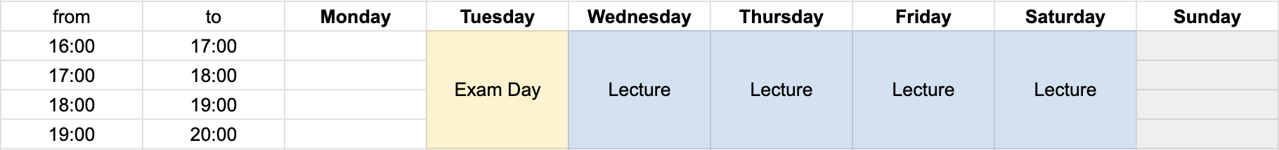 The weekly teaching activity during the first phase is organized in lectures from wednesday to saturday and lab hours that allow students to experiment on the field the methods shown in the lectures with the support of the tutors. The steering committee has established that, in order to obtain the degree, each student is required to attend at least 70% of the total hours of lectures and laboratory sessions. The weekly teaching schedule is described in detail in the following images.